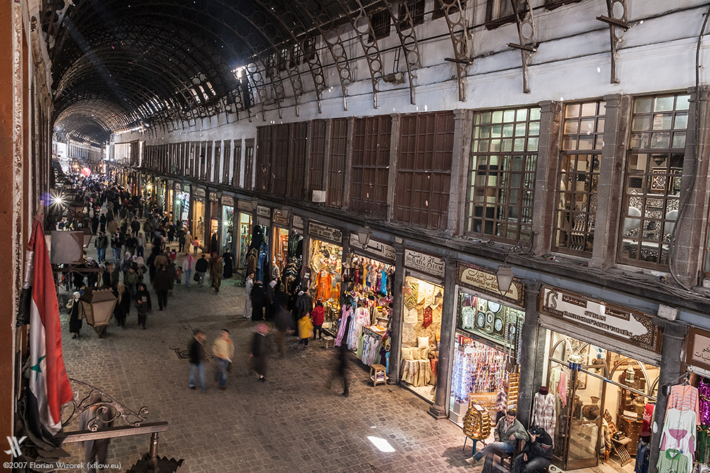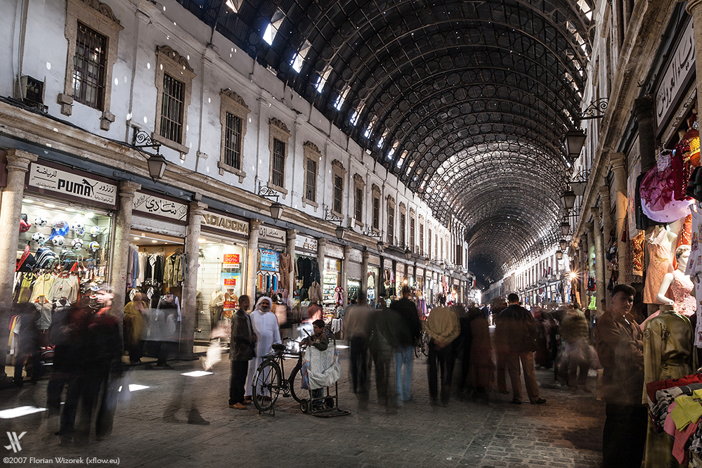 Nach kurzer und zugegebenermaßen recht kalter Nacht, Damaskus liegt auf ~700 Meter Höhe und es war früher März, führte mich mein erster Weg, wie von einem Magneten angezogen, automatisch in die Altstadt, vorbei an der großen Saladin-Reiterstatue die die Zitadelle bewacht, zum westlichen Eingangstor des wichtigsten und größten Basars der Stadt ist, dem Suq al-Hamidiya. Dieser von Wellblech überdachte Schlauch ist übrigens auch ein Zeugnis jüngerer Geschichte, denn die vielen Löcher im Dach die so wunderschön das Licht durchfluten lassen sind Einschusslöcher eines französischen Überfalls.