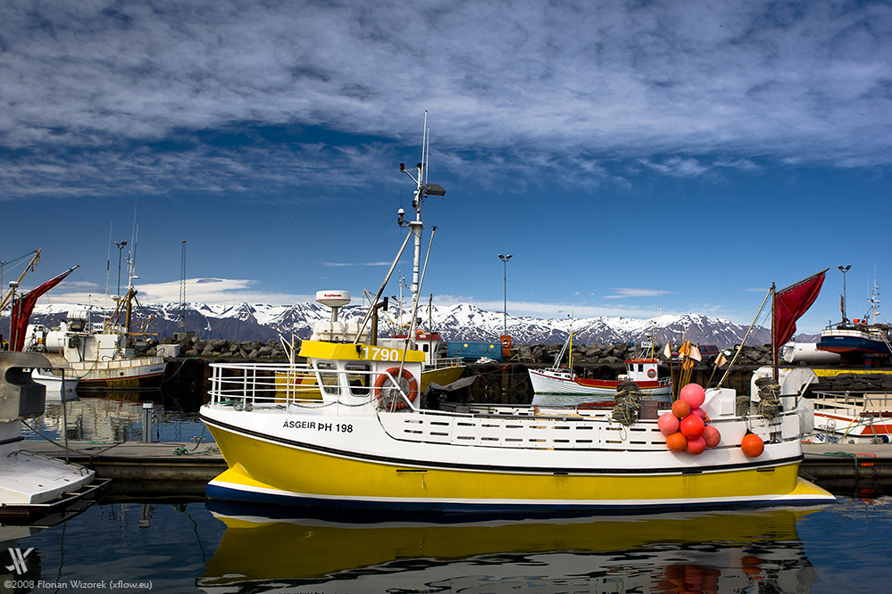 Das niedliche Fischerstädtchen Húsavík war einst ein Zentrum der Fischerei. Heutzutage spielt das Fischen zwar auch noch eine wichtige Rolle, allerdings wird dieser Wirtschaftszweig mittlerweile vom Tourismus abgelöst. An der Skjálfandi Bucht und vor den schneebedeckten Bergen des Víknafjöll gelegen, ist Húsavík der isländische Star in Sachen Whale Watching. Gleich zwei größere Familienbetriebe haben sich diesem Highlight angenommen. Ihre Flaggen flattern unverkennbar im Ortszentrum, gleich am Eingang zum Hafen, neben der Touristeninfo und unweit der Kirche.