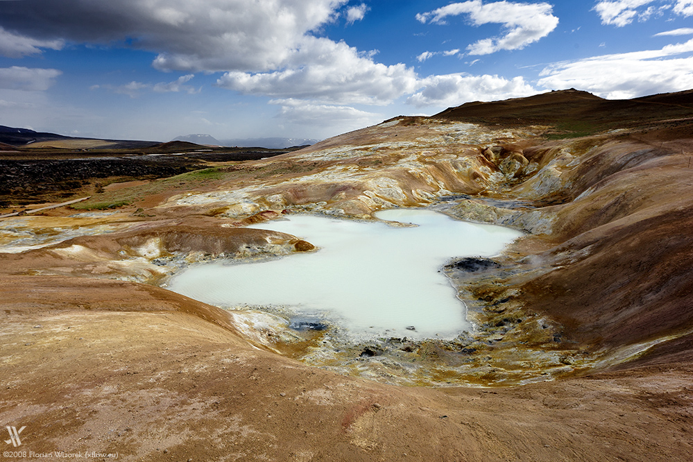 Ganz in der Nähe des riesigen und nahezu außerirdisch anmutenden Mývatn Sees liegen die Solfataren von Námaskarð/Námafjall mit ihren recht großen und vor allem stinkenden Fumarolen. Unaufhörlich dringt dort ein im wahrsten Sinne des Wortes atemberaubendes Schwefelwasserstoff-Wasserdampf-Gemisch fauchend durch die Erdoberfläche. Gleich daneben quackert und blubbert es; diverse Schlammvulkane durch die Landschaft.