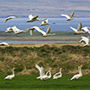 Wer Gänse oder Singschwäne beobachten will muss allerdings etwas Geduld mitbringen. Die Fluchtdistanz dieser Tiere ist eine Liga für sich. Wenn man gut ist, schafft man es auf 300 Meter an die Tiere heranzukommen. Singschwäne durchkreuzen auch gern mal die Routen der Autos indem sie in Tiefflugmanier die Schotterpisten des Landes kreuzen. Die stark auf ihren Partner fixierten Tiere führen bei nahezu jedem Aufeinandertreffen ein Begrüßungsritual auf, auch wenn sich der Partner nur 40-50 Meter entfernt haben sollte. Wunderschön.
