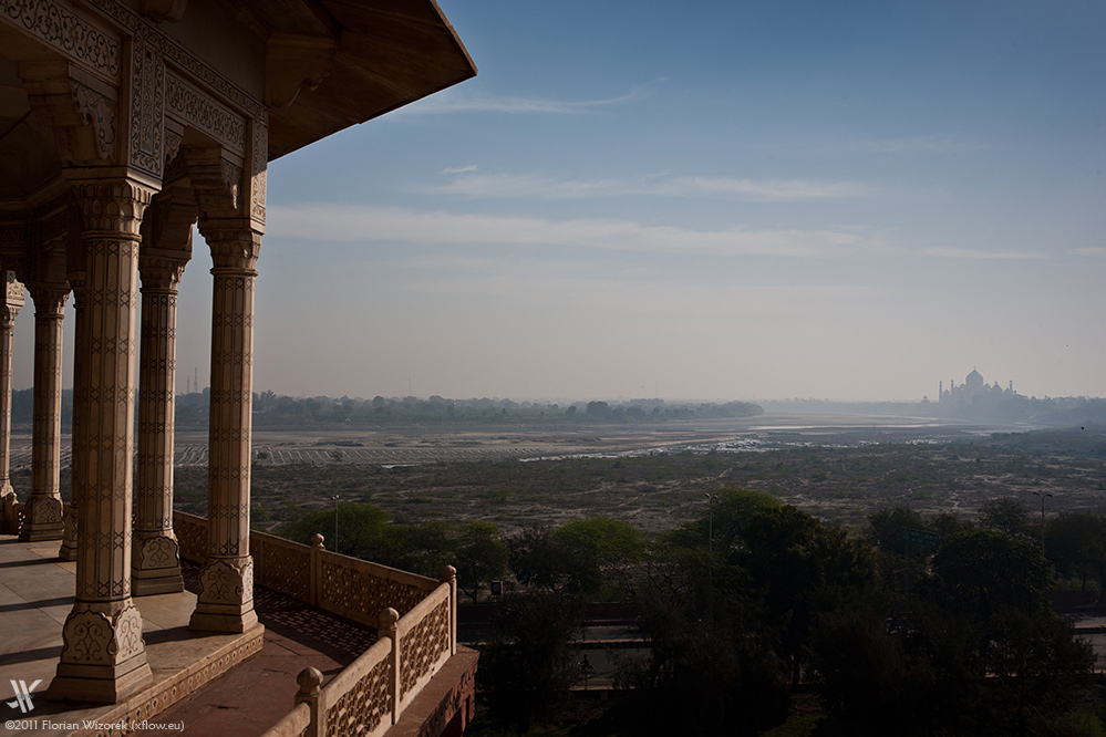 Sowohl Sonnenaufgang als auch -untergang am Taj Mahal sind überbewertet, denn am ehesten bekommt man einen feinen Lichtsaum am Gebäude zu Gesicht. Das liegt am den Horizont verpestenden Smog, der wie ein Türsteher im Berliner Club Berghain Streiflicht wenn überhaupt nur willkürlich und sporadisch, geschweige denn das Restlicht der Blauen Stunde zum Taj vordringen lässt. Der Bau ist mit einem todesstreifenartigen Stacheldrahtzaun umgeben der die eigentlich schöne Szenerie am Fluss, mit den auf den Sandbänken ihr Gefieder trocknenden Kormoranen, gnadenlos zersägt.