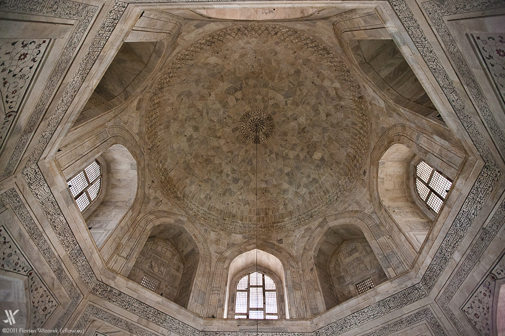 Wiederum nicht weit vom Baby Taj, an der gleichen Straße gelegen, findet sich der 450 Jahre alte Bau „Chini-Ka-Rauza“. Das schon etwas stärker den Elementen ausgesetzte Gebäude diente einst als Moschee, wovon die im Inneren abgebildeten Suren zeugen. Da das Sonnenlicht nur wenig Zugang zum Gebäudeinneren erlangt, sieht man auf den ersten Blick nur wenige Farben. Die Kamera jedoch kitzelt aus den alten Fresken jegliche Kontur und Farbnuance heraus, so dass das Chini-Ka-Rauza zumindest aus fotografischer Sicht nicht uninteressant ist. Ist es draußen allzu warm, so bietet das aus starken Mauern gestaltete Innere des Chini-Ka-Rauza eine willkommene Abkühlung.