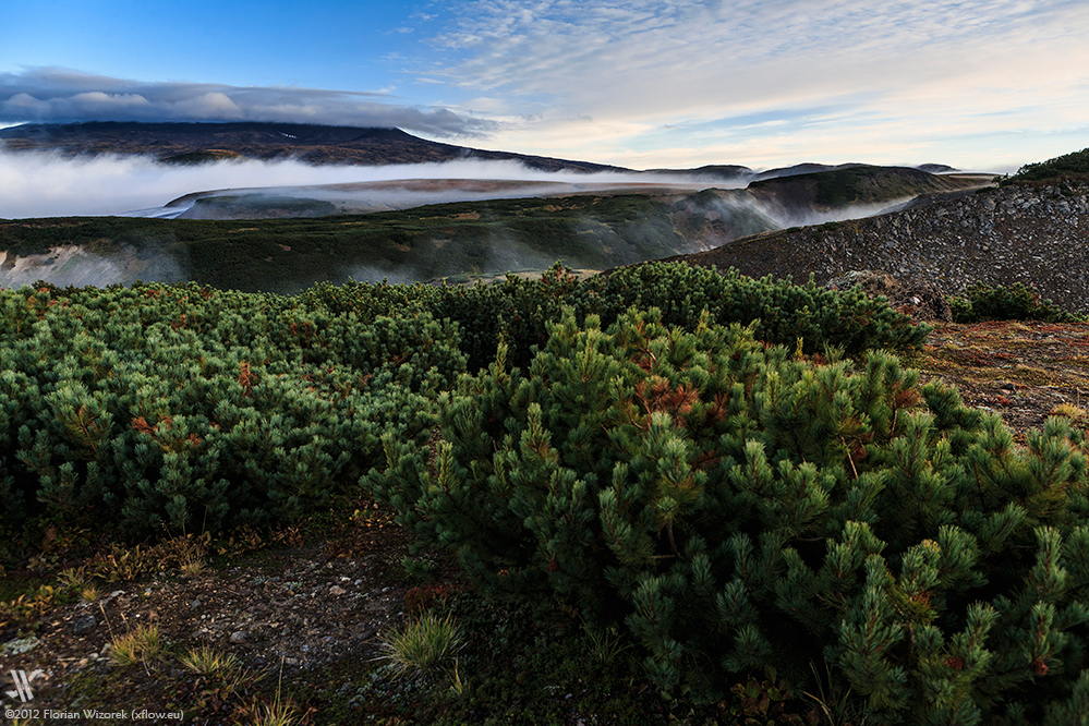 Doch wir kommen alle ohne größere Blessuren wieder im Base Camp an. Alles tropft, die komplette Kleidung wie Ausrüstung ist vom fiesen Nieselregen hart ins Gebet genommen worden. Nun ist erst einmal Pflegen und Trocknen angesagt. Der Ofen in unserer kleinen Hütte läuft auf Hochtouren, die Luftfeuchtigkeit darin gleicht fast einer Banja. Letzteres Vergnügen hatte ich in Jelisowo, wo Jewgeni Petrowitsch, der Mann von Galina, eine private Banja hat. Doch bevor wir wieder an den Ausgangspunkt unseres Abenteuers zurückkehren, machen wir am Fuß des erkalteten Vulkans Wiljutschinski (Вилючинский) Station wo heiße Quellen auf uns warten und als würde uns die Sonne ein dickes fettes „Ätsch!“ ins Gesicht schreien wollen sind die vorletzten zwei Tage vom Licht und Wetter her wunderbar. Derartiges Klima hätten wir andernorts mit Kusshand genommen. Aber man kann nicht alles haben.
