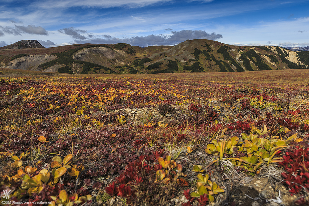 Die Szenerie am Wiljutschinski, mit den Riesen Korjakski und der Awatscha im Hintergrund und einer wunderbar farbigen Bergtundrawiese im Vordergrund, wird eines der optischen Highlights meines gesamten Ritts durch Kamtschatka. Vielleicht auch, weil sich beim Fotografieren ein wenig Abschiedsschmerz und die Einsicht in die Bildkomposition schleicht, dass es rückblickend betrachtet nicht immer das typische Postkartenwetter sein muss um interessante Fotos zu schießen. Mit seinen klimatischen Herausforderungen erinnert Kamtschatka daran, dass es vor allem (wie eigentlich immer und überall) auf das fotografische Umsetzen der Stimmung vor Ort ankommt.