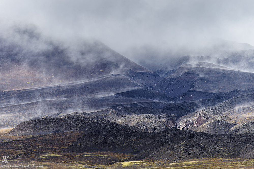 Während wir auf dem Goreli rumkraxeln und die Atemmaske beim Durchqueren der Gaswolke gesundheitswichtige Dienste leistet, höre ich ein dumpfes lang gezogenes Wummern, als ob man direkt neben einem riesigen Subwoofer stehen würde. Das ist der Klang des Magmas das tief im Inneren des Bergs arbeitet. Gänsehaut pur, denn bis auf die markerschütternden Explosionen des Yasur hat bis dato kein Feuerberg diesen eigentlich immer präsenten vulkanischen Charakterzug derart phänomenal und plastisch rüberbringen können. Doch das Wetter kommt näher, der Mutnowski entschwindet bereits im dichten Grau und auch wir werden sehr bald von einer rapide absinkenden Wolke eingeschlossen.