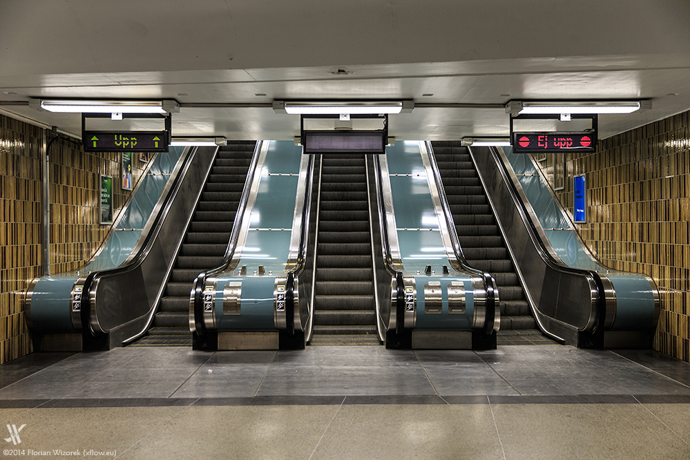 Nächster optischer Knaller ist der in dominantes Blau getauchte unterste Bahnsteig am T-centralen, dem Knotenpunkt auf dem alle drei Linien zusammenlaufen. Diesen Bahnhof menschenfrei ablichten zu können ist ein Ding der Unmöglichkeit, es sei denn, man nennt einen stärkeren Graufilter sein eigen. Anders als in Berlin, wo allein die Anwesenheit eines Fotografen bereits todwünschende Blicke heraufbeschwört, zeigt der schwedische Alltag kein Fremdeln im Beisein von Kamera und Stativ. Das Treiben am T-centralen stellt dies eindrucksvoll unter Beweis.