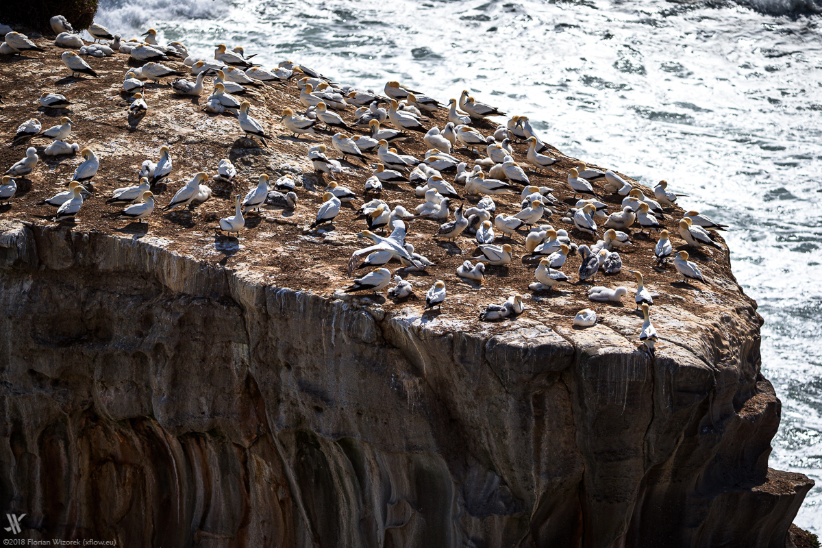 Neuseeland hat neben omnipräsenten Kormoranen und den Albatrossen im Fiordland-Nationalpark (auch auf der Otago Halbinsel beheimatet) noch andere Gebiete wo sich ganz spezielle Seevögel dauerhaft niedergelassen haben. Die Rede ist vom australischen oder australasischen Tölpel, der trotz seines Down Under bezogenen Namens eher der Fauna Neuseelands denn Australiens zuzuordnen ist, denn dort, im Reich der Kiwis, hat er mit einem Anteil von ~90% an der Gesamtpopulation sein weitaus größeres Vorkommen. Im Wesentlichen am Cape Kidnappers. Weltweit wird der Tölpel übrigens nur von Deutschen und Polen als Tölpel, und damit Dummkopf (bzw. auf polnisch głuptaków) bezeichnet. Dumm sind diese kleinen Kerle definitiv nicht…