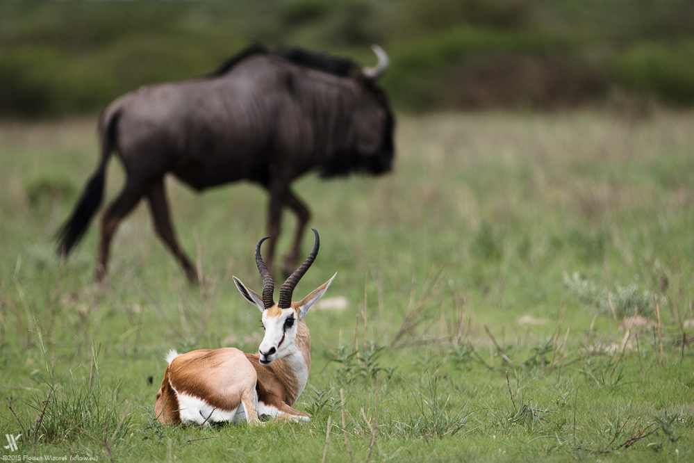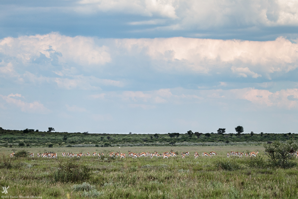 Die ohnehin bereits flache Landschaft wird beim Betreten der kleinen lokalen Salzpfannen sogar noch flacher. Einzeln stehende Bäume wirken ob dieser Plattheit schon wie Berge. In genau jenen Salzpfannen aber tummelt sich das Leben. Heerscharen von Gazellen grasen oder rasten im Schatten des Gebüschs während Straußenfamilien an Ihnen auf der Suche nach Futter vorbeiziehen. Größere Ansammlungen von äußerst anpassungsfähigen Spießböcken (Oryxantilope) und Streifengnus, die ihre Jungen gerade erst zur Welt brachten, sind eine Augenweide. Man muss beim Fahren echt aufpassen nicht irgendein Tier, sei es noch so klein, zu überrollen!