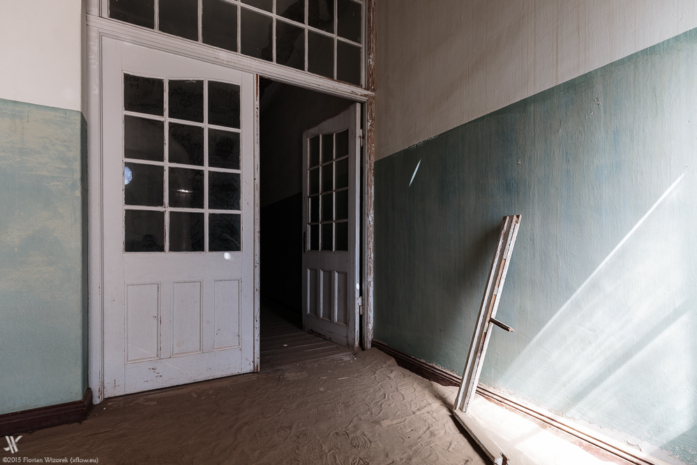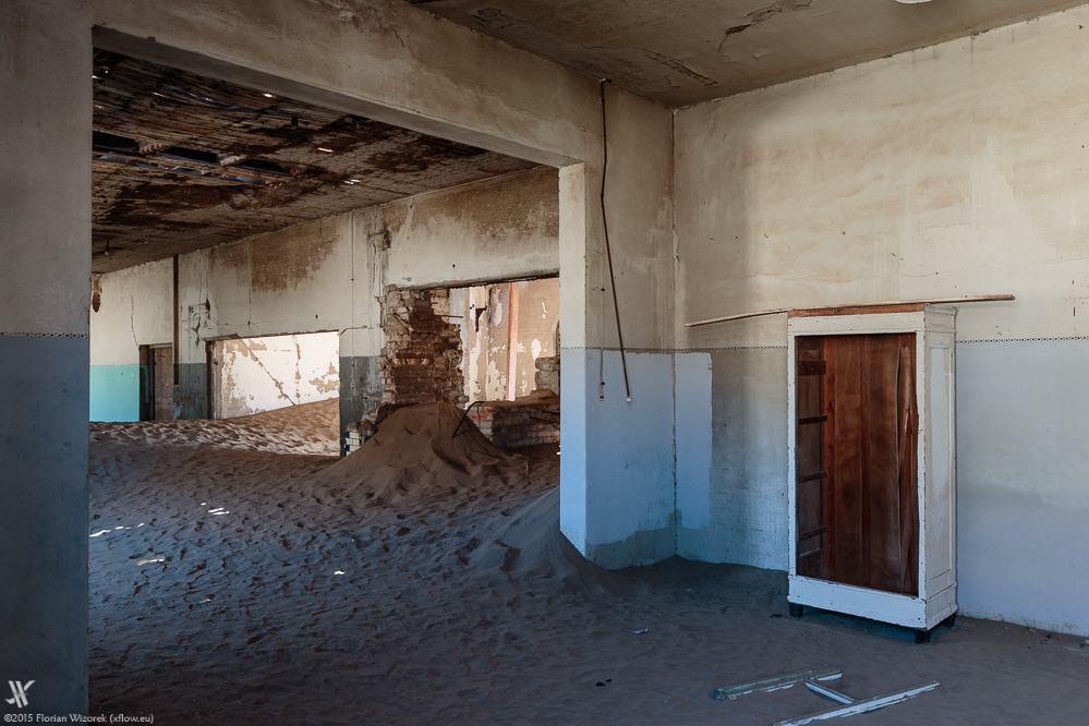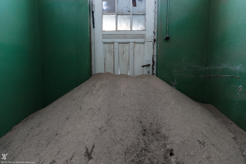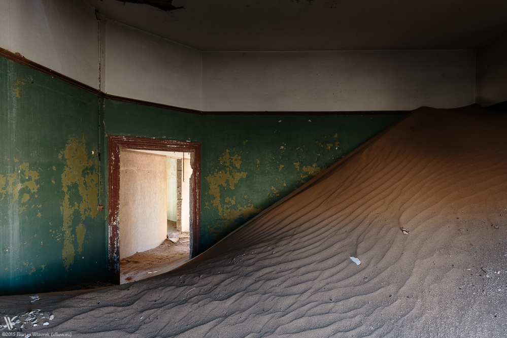Manch Gebäude, manch Raum ist komplett vom Sand erobert. Durch die mit Brettern und Blech vernagelten Türen wie Fenster plärrt die unerbittliche Wüstensonne und erzeugt Kontraste, die härter nicht sein könnten. Vielerorts ist die Tapete noch erhalten und es ist irgendwie lustig, dass derartige Wandmuster heute in Berlin wieder „hipp, geil und in“ sind. Ebenfalls erstaunlich gut sind die Wandfarben noch erhalten, und so erstrahlt das Innere Kolmanskops nicht selten in intensiven Blau-, Grün- und Rottönen.