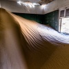 Zerborstene Fensterscheiben bringen den Wind zum Singen. Der Wind wiederum bringt jene Glasfragmente zum Klappern. Der Zustand der Gebäude differiert stark. Manch auf den ersten Blick fragil wirkendes Außenklo könnte man heute noch problemlos besuchen, vielleicht sogar benutzen, während eigentlich stabiler wirkende Konstrukte einem drohen auf den Kopf zu fallen. Vielleicht sind einige Dächer ob der Sandlast eingebrochen, vielleicht war es aber auch Vandalismus als die Zelte abgebrochen werden mussten, denn herumliegende Türen und Fenster kann man wohl schlecht auf Wind, Wetter oder Nebeltrinker-Käfer zurückführen.