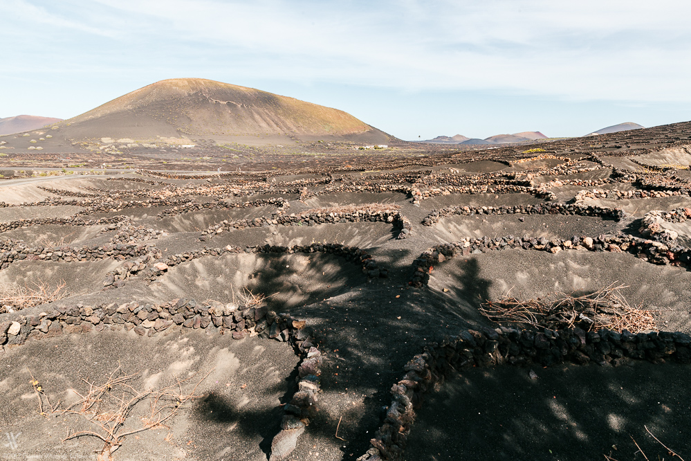 Die auf dem Boden wachsende Malvasia-Rebe wird gedeiht windgeschützt in einem Trichter aus Vulkanasche. Die Feuchtigkeit wiederum fängt die poröse Vulkanasche ein, leitet diese zum Boden des konischen Kraters wo eine Packung Lehm dafür sorgt, dass das wertvolle Nass nicht versickert sondern der Pflanze zugutekommt.