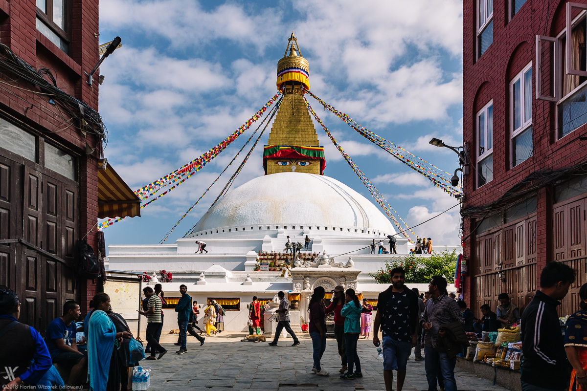 Da steht er, versteckt zwischen den liebevoll restaurierten, historischen Häusern und ragt 36 Meter in den Himmel über Katmandu. Er ist einer der größten seiner Art und glücklicherweise umgehend restauriert worden, als das große Erdbeben in 2015 mit 7.8 auf der Richter-Skala zuschlug. Eigentlich umrunden den Stupa immer Menschen, besonders intensiv aber ist dieses Treiben in den Morgen- und Abendstunden. Und jetzt früh um kurz nach 6 Uhr sind wir die einzigen westlichen Touristen hier.