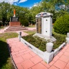 In Hennigsdorf angekommen habe ich Schwein…! Die städtischen Grünanlagenpfleger sind vor Ort und lassen mich aufs sonst abgeschlossene Gelände. Mit seinem Sowjetstern verzierten Zaun und der typischen Symbolik ist das sowjetische Ehrenmal im Hennigsdorfer Rathenau-Park eine Grabanlage wie aus dem Bilderbuch. Wenige Fahrradminuten später bin ich in Stolpe Süd, so sich ein weiteres Ehrenmal befindet. Auch diese Anlage ist umzäunt. Die drei Gräber in der Vorderreihe dominieren das Ehrenmal optisch. Dahinter befindet sich ein großer Sowjetstern auf dem Boden und dahinter wiederum der Obelisk.