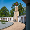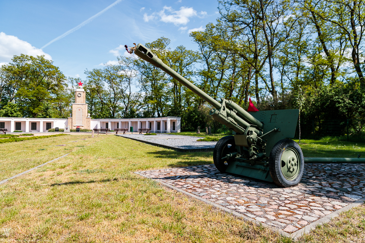 Neben Bier und Bratwurst ist Lebus auch aus Sicht der sowjetischen Ehrenmale nicht unwichtig. Denn hier finden all jene Soldaten ihre letzte Ruhe, die auch heute noch international aufgefunden werden. Mit 40 bis 50 Funden pro Jahr allein im Land Brandenburg ist das alles andere als wenig. Genau wie Reitwein ist auch die Anlage in Lebus groß. Abgerundet wird sie, im wahrsten Sinne des Wortes, durch den Obelisken und die Kolonnaden am östlichen Ende. Besonders hervor sticht das Artilleriegeschütz, welches auf halber Höhe der Kriegsgräberstätte steht. Wie bestellt fliegt ein Gartenrotschwänzchen ein und lässt sich auf dem mit Blumen geschmückten nieder Mündungsfeuerdämpfer, als ob eine höhere Macht den Friedensaspekt meiner Fotoserie versucht zu untermauern.
