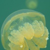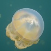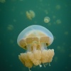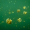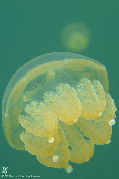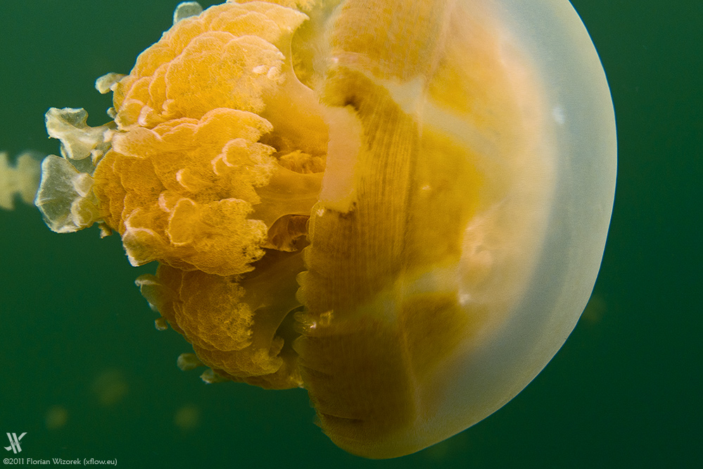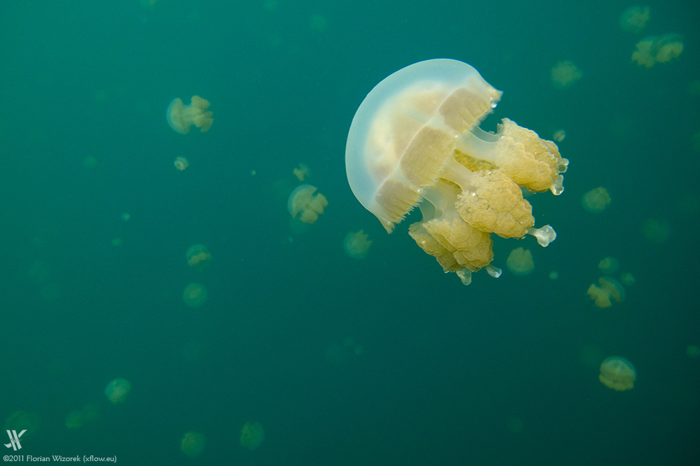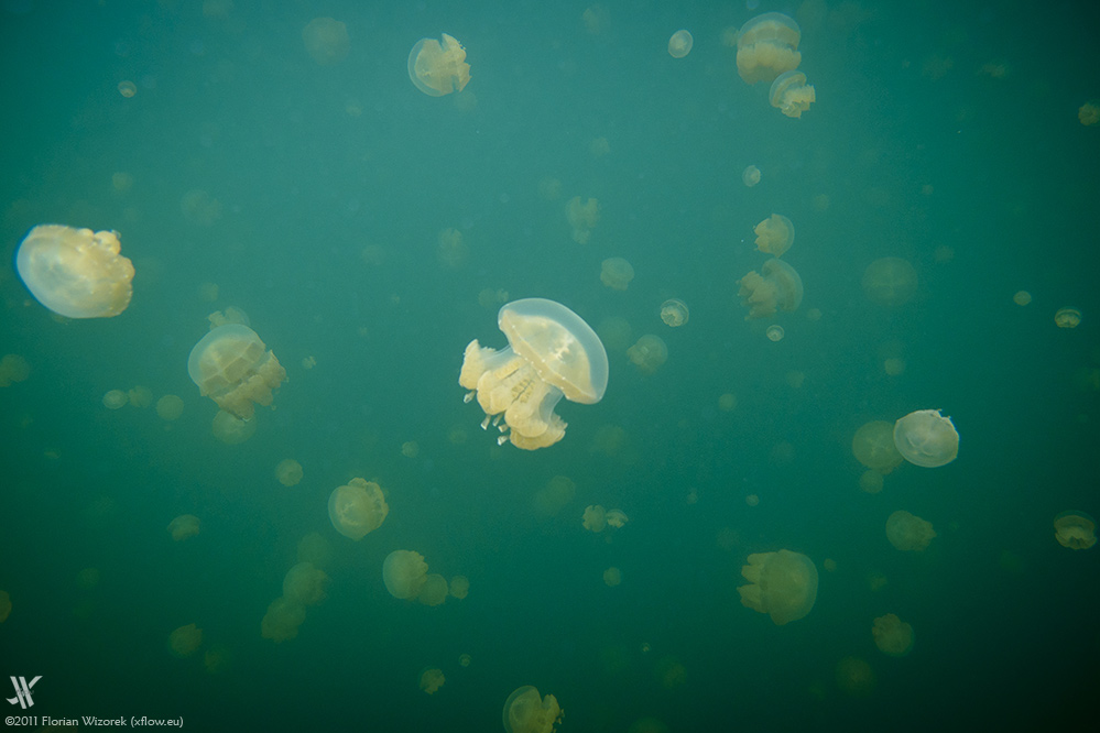 The jellyfish are living in symbiosis with algae that logically only can start photosynthesis if there’s sufficient sunlight available. The animals are rising to the surface if light conditions are tame, then snorkelers get surrounded by dozens of jellyfish and they become hundreds when staring into the watery distance of the lake. The light being reflected by the jellyfish chute looks wonderful and depending on the actual sunlight it is changing from yellow to orange. Same applies to the lake that sometimes appears in a cold turquoise blue but then changes to a surreally glowing saturated green.