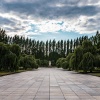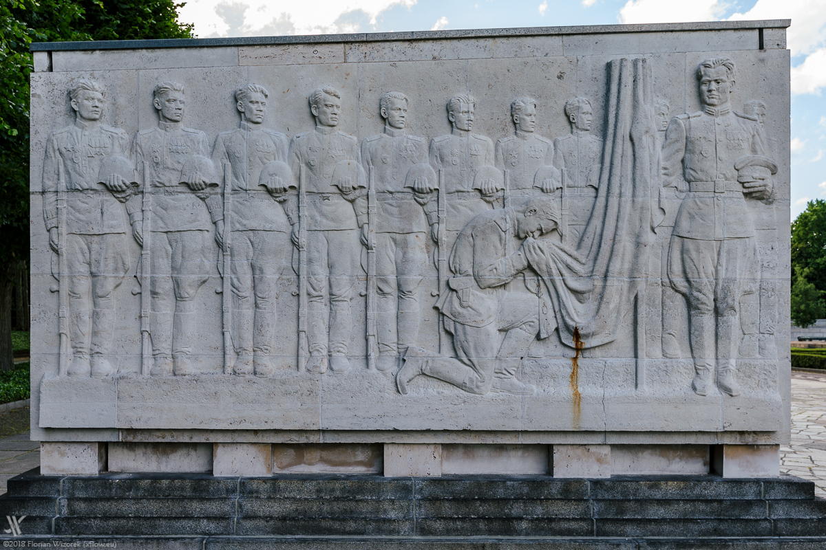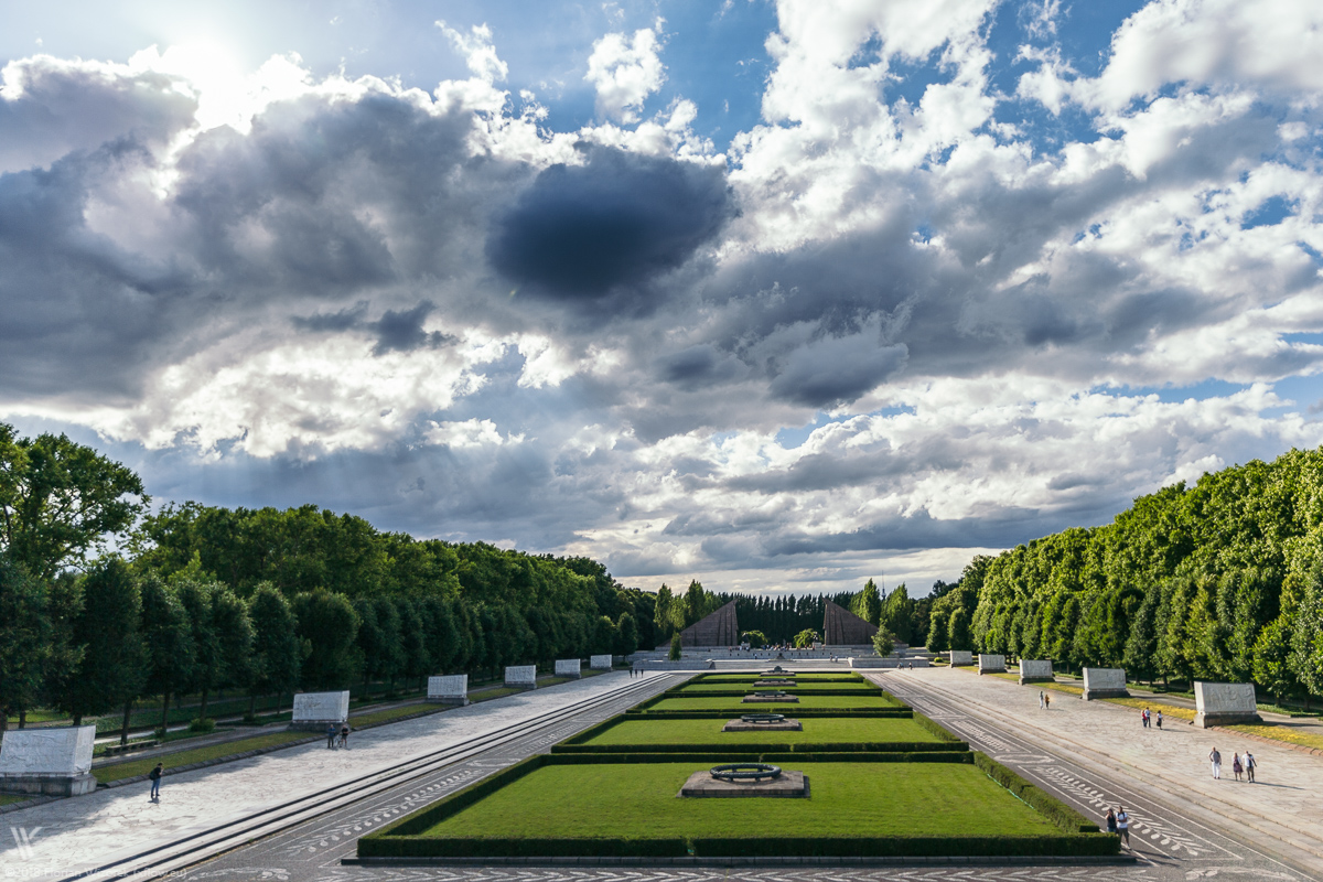 After having entered the memorial through the granite triumphal arch on Puschinallee street, you immediately spot the site’s central element, the statue “The Liberator” built by Yevgeny Vuchetich. It shows Soviet soldier holding a longsword in his one and a young child with his other hand. The statue stands on a shattered swastika (Hakenkreuz).