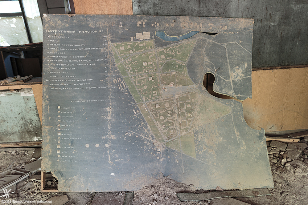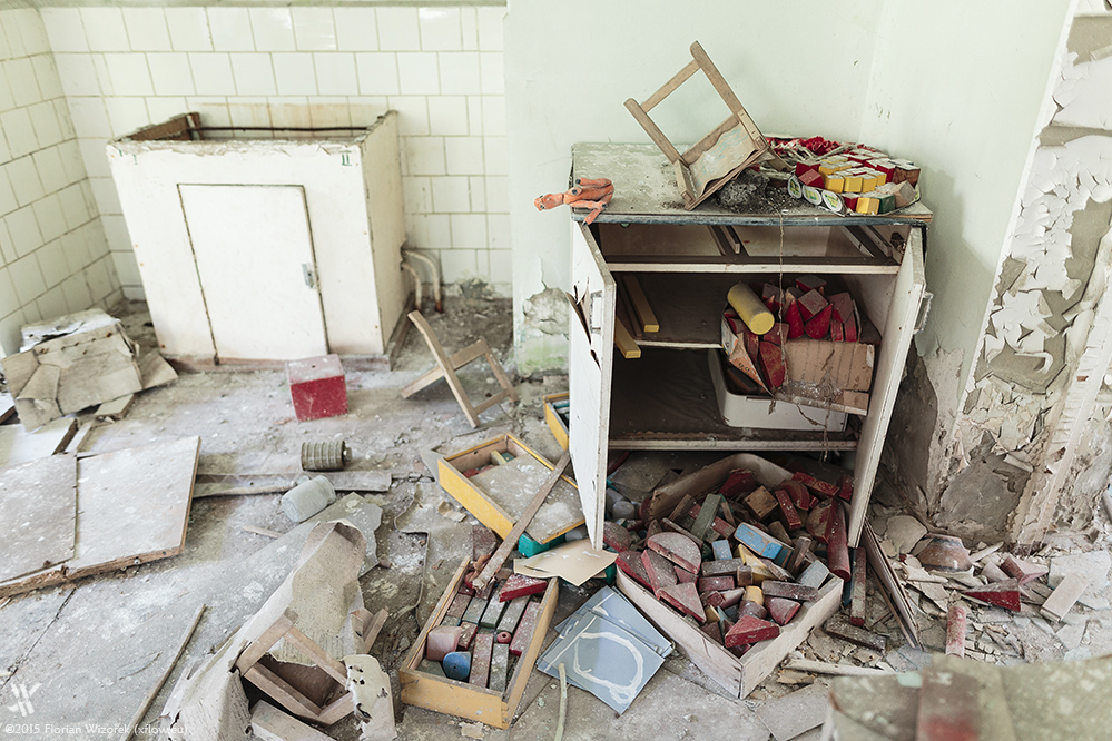 Not far away from the harbour is the KBO building, the home of craft like hairdressing and clock maker. Around the corner of that building is the hospital, where Misha takes me on an exploration from the very top to the very bottom. “Do you want to see something really crazy?” he asks. Well, you know my answer ;-) In the basement he shows me what a piece of dirty cloth does with his radiation detector: it wails as if there’s no tomorrow and displays some incredible 450 µSv/h. Just to remind you: the annual radiation dose a human is used to is ~4mSv, hence ~11 µSv per day. So, the cloth is cloth with a kick. It was part of the fire fighter’s garment, the ones being called to the accident site at first. Being profoundly exposed to radiation they got hospitalised, first in Pripyat then in Moscow. In the basement of the Pripyat hospital there is still the nasty trap to bump into the nuclear heritage of their uniforms.
