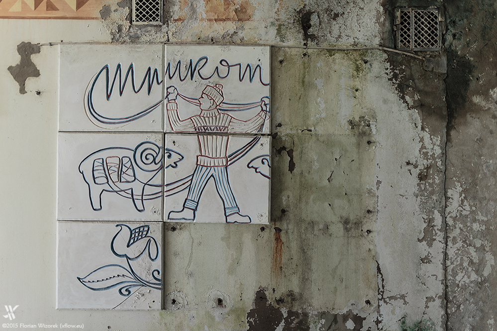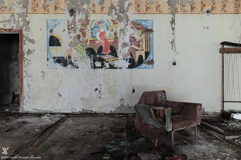 On the next day we go back to the ghost town. From the north-western end, that is only 15km away from the border with Belarus, we work ourselves through the remaining buildings. Also Byelorussia got heavily contaminated. Like Chernobyl and Pripyat the region around Gomel shows an increased radioactivity, hence it’s no surprise that the Byelorussians set up an exclusion zone as well. We move through the houses that once accommodated the indoor swimming pool, the children’s hospital, the second Kindergarten as well as the café near the harbour where hydrofoils left on pleasure trips to Kiev.