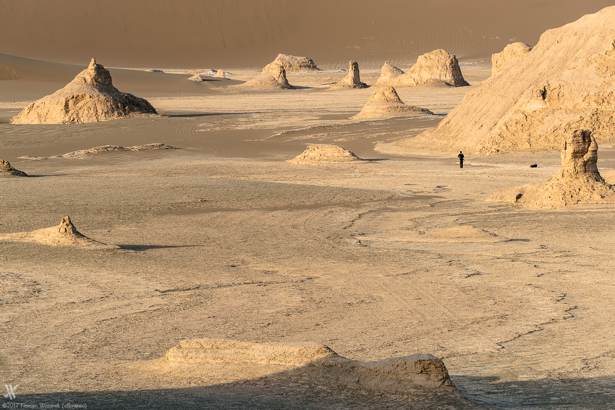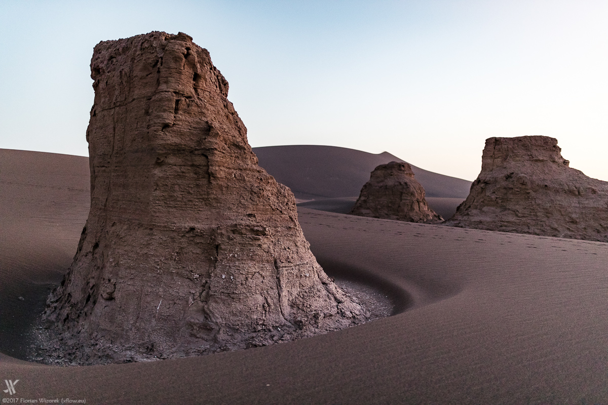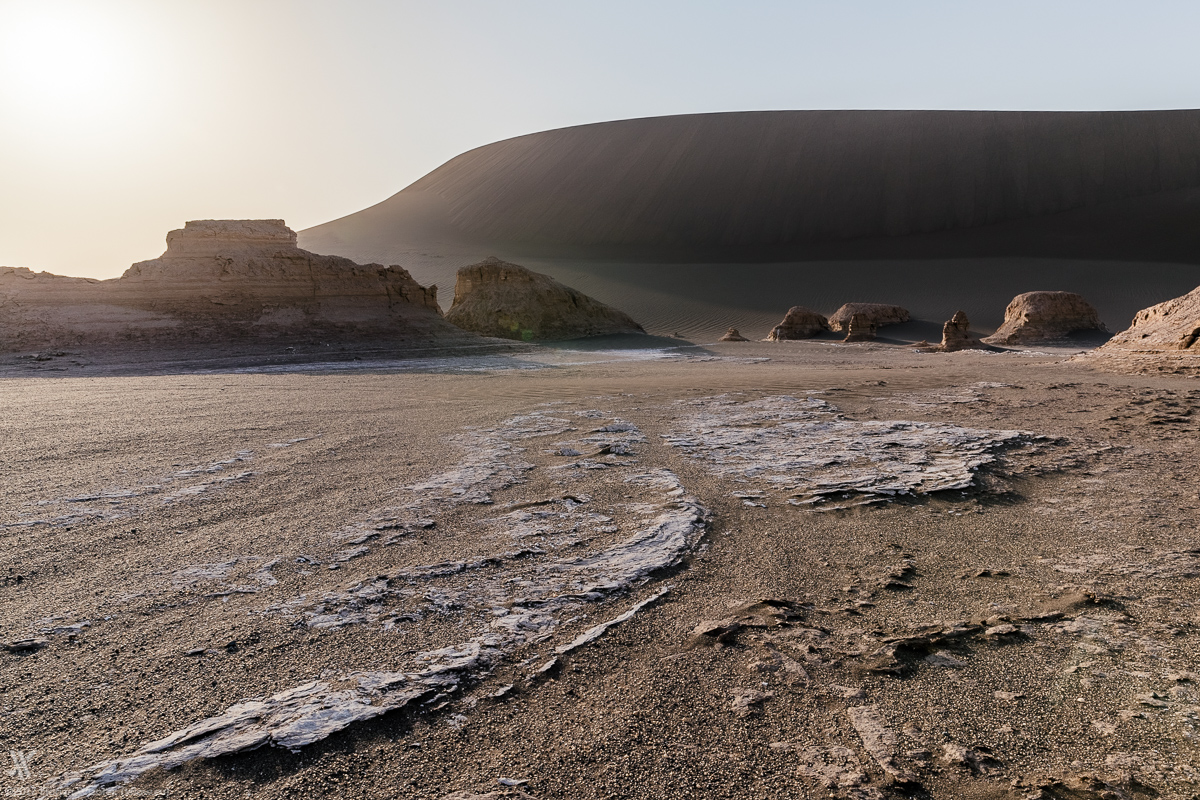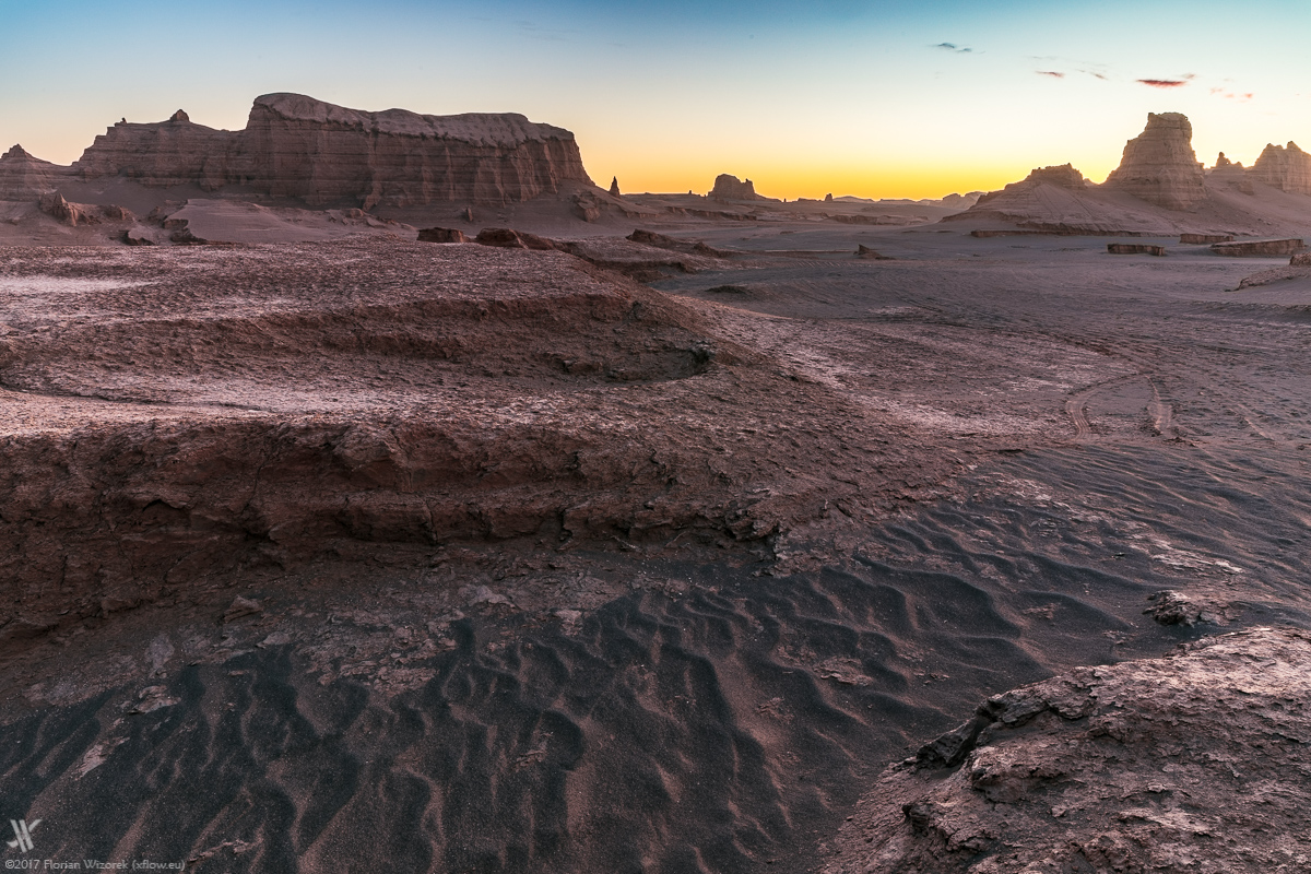 Again we wake up early to eyewitness how Iran’s largest desert, soaks up the first light of a new day. Yet again the veil of dust at the horizon allows the sidelight only to boost the sand colour of the rocks. As usual in the desert the morning is far away from a colour explosion in the sky. Chemistry is right among us travellers, hence we walk our way together as well as individually to capture the morbid charm and beauty of Dasht-e Lut onto digital celluloid.