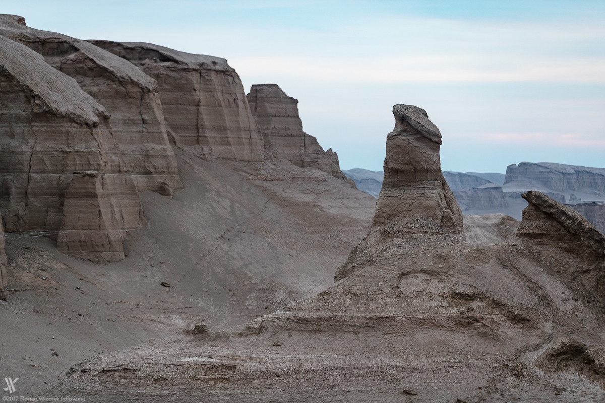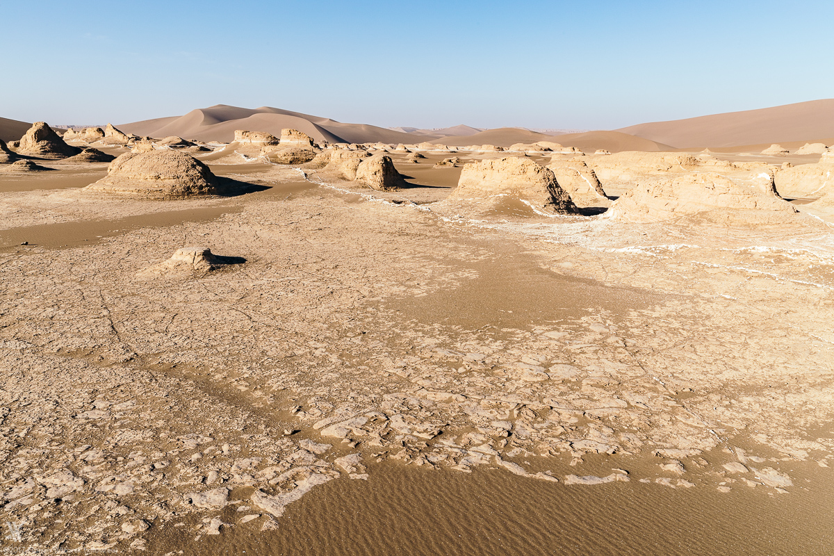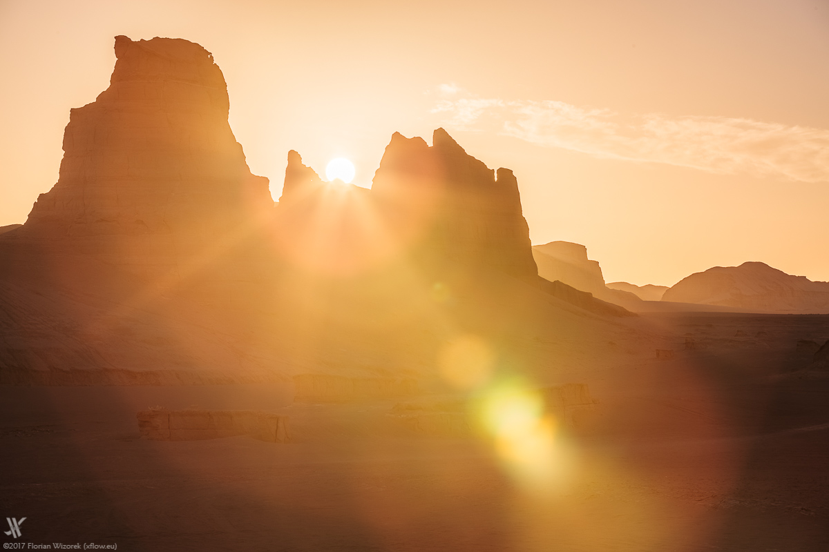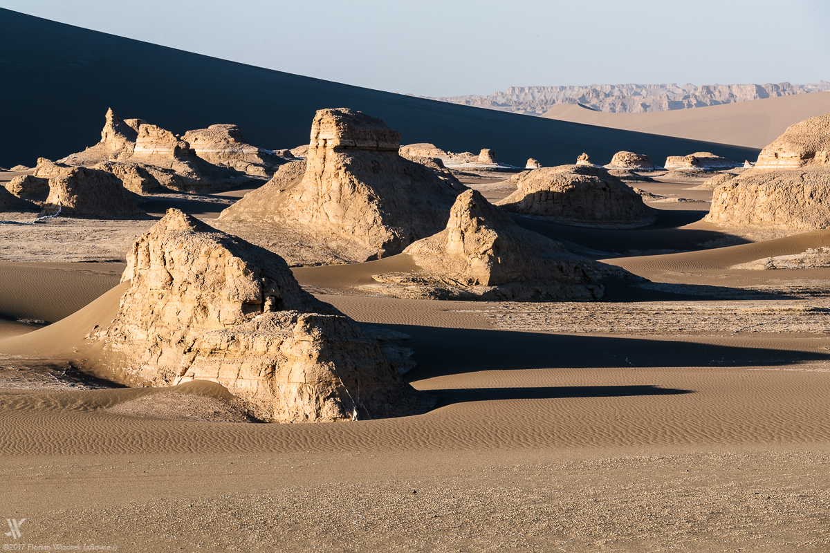 Again we wake up early to eyewitness how Iran’s largest desert, soaks up the first light of a new day. Yet again the veil of dust at the horizon allows the sidelight only to boost the sand colour of the rocks. As usual in the desert the morning is far away from a colour explosion in the sky. Chemistry is right among us travellers, hence we walk our way together as well as individually to capture the morbid charm and beauty of Dasht-e Lut onto digital celluloid.