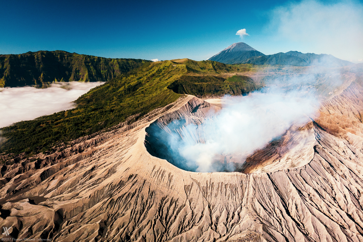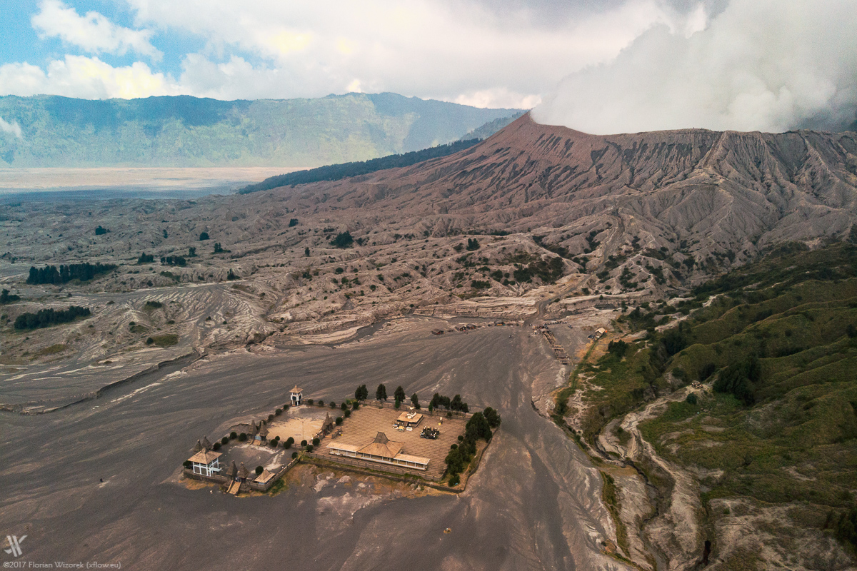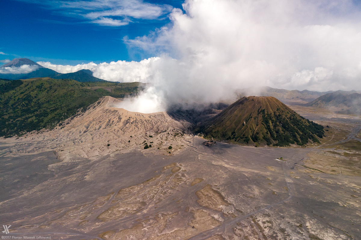 10 years ago I walked the 241 steps staircase up to Bromo crater rim as well. Then as now visitors have to cope with nasty volcanic dust. Most of them don’t have a clue that Bromo has the potential to spontaneously eject a powerful eruption column blasting everyone from the crater rim. These days I save those dust pains and send the drone up. Starting at the very foot of the volcano I fly through a small canyon up to the rim. The drone delivers great footage of the touristic flow going up and down the staircase.