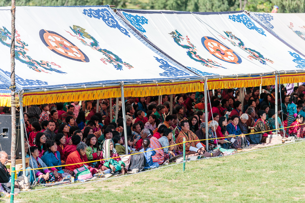 Anyone thinking that it is cold at 2.000 metres above sea level is in error. Before visiting the big Thimphu Tshechu, we go to rural areas in the south of Punakha. There we attend to a smaller Tshechu and first mask festival ever in the village of Wangdue on exactly those 2.000 meters of altitude mentioned before. The sun relentlessly fries everything that is not in the shade. The organisers know this, and that’s why long tents were set up. For us western tourists free serving of SPF 50+ sun cream would be quite nice.