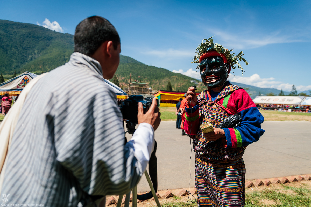 Strangely enough, Bhutan – compared to Nepal, for example, and from the point of view of a Western tourist – is often, not to say very often, about money. Hence I make fun posing with one of the red masked clowns. He with cash in his hand, me with a credit card. Fortunately, only cash counts as otherwise my credit card would get kidnapped quickly. The grannies next to us are amused by that, but so far, they have been asked to pay up once only…